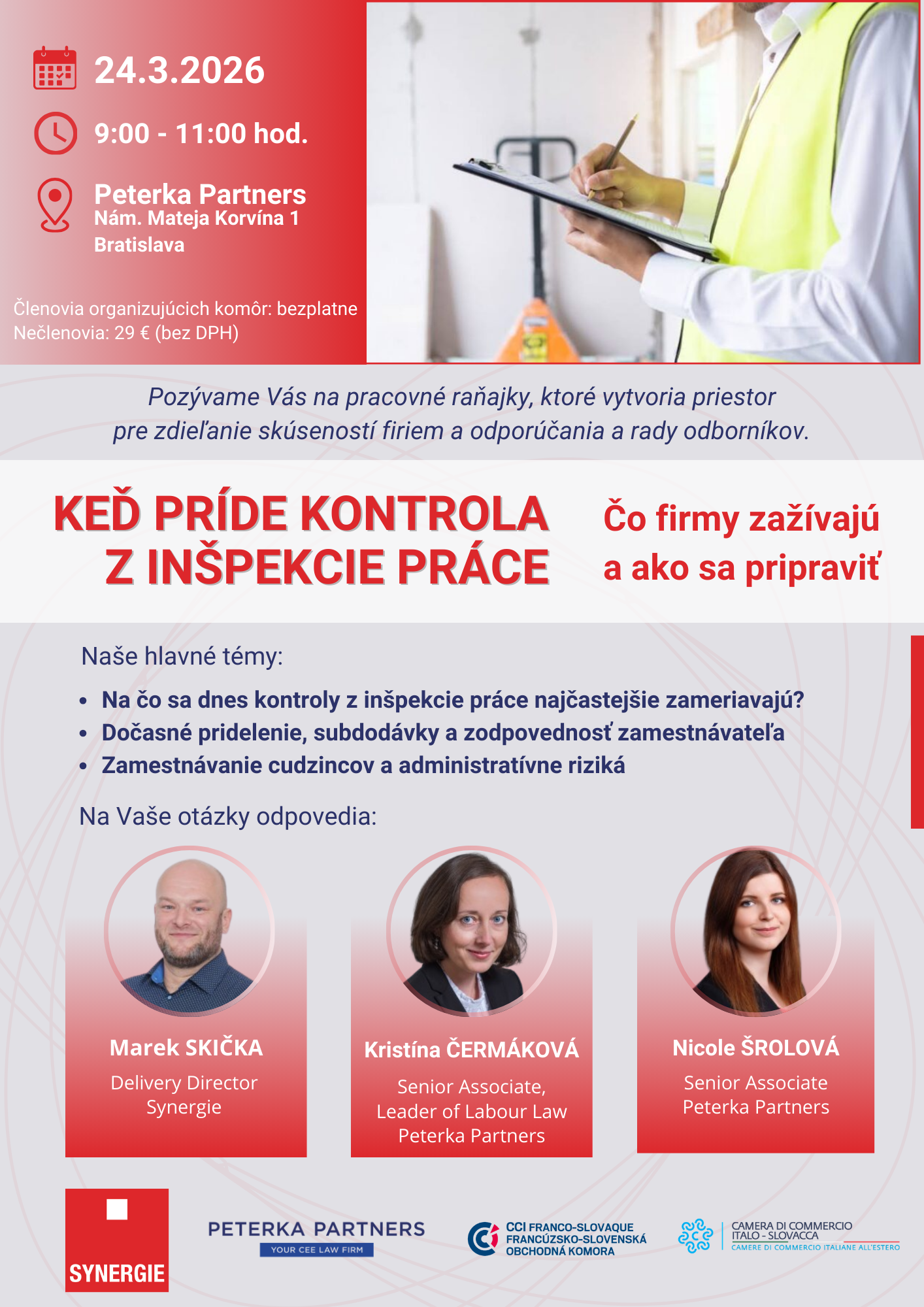 Túto tému rozoberieme na pracovných raňajkách, na ktoré Vás pozývame vďaka spolupráci s našimi členmi SYNERGIE a PETERKA PARTNERS.
