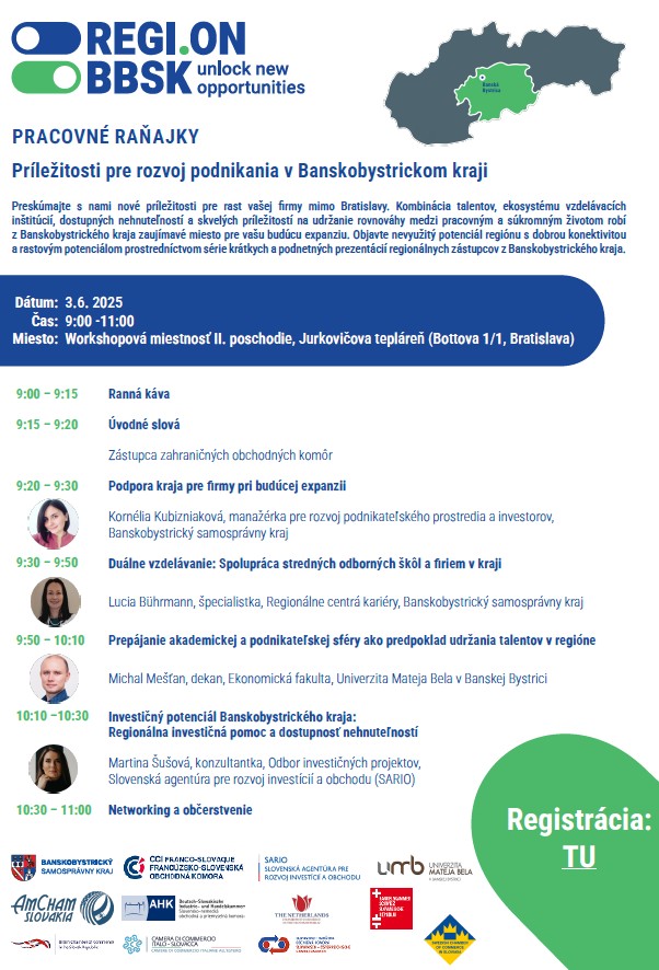V spolupráci s Banskobystrickým samosprávnym krajom a ďalšími zahraničnými obchodnými komorami Vás pozývame na tieto pracovné raňajky.