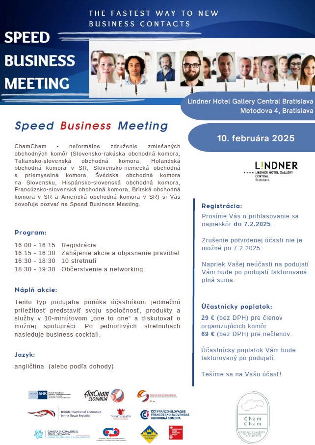 V spolupráci s ďalšími zahraničnými obchodnými komorami na Slovensku Vás pozývame na prvý tohtoročný Speed Business Meeting - obľúbené networkingové podujatie, ktoré je pre Vás výbornou príležitosťou na nadviazanie nových obchodných partnerstiev.