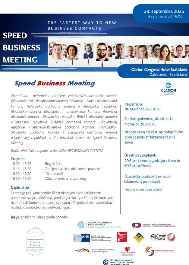 Pozývame Vás na tretí Speed Business Meeting v tomto roku - obľúbené networkingové podujatie, ktoré je pre Vás výbornou príležitosťou na nadviazanie nových obchodných partnerstiev.