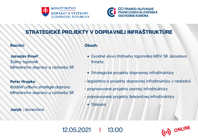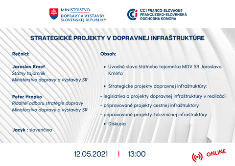 V spolupráci s Ministerstvom dopravy a výstavby SR Vás pozývame na webinár venovaný strategickým projektom v cestnej, leteckej a železničnej infraštruktúre.
