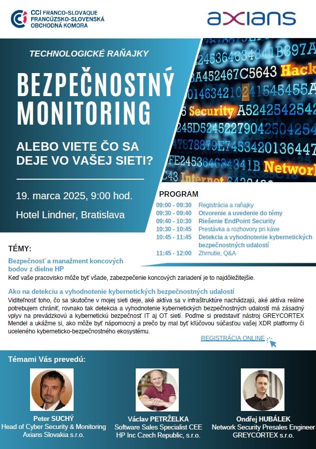 Radi by sme Vás pozvali na technologické raňajky s názvom Bezpečnostný monitoring, ktoré pripravuje náš člen AXIANS v stredu 19.3.2025 od 9:00 hod. v hoteli Lindner v Bratislave.