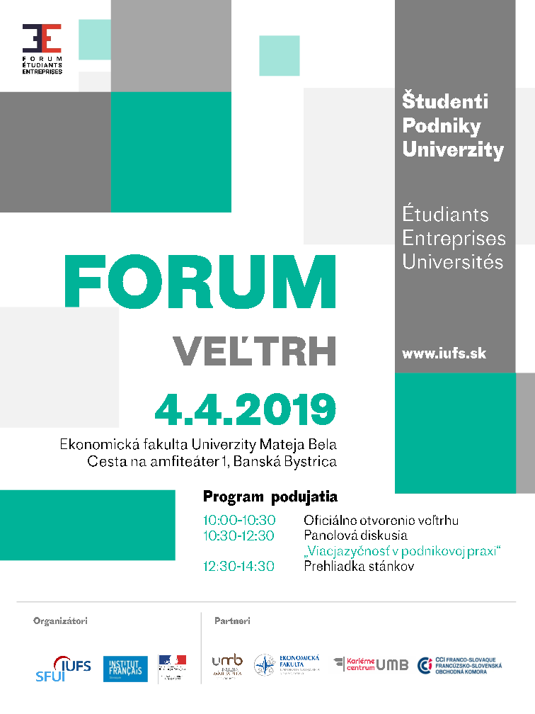 Slovensko-francúzsky univerzitný inštitút a Francúzsky inštitút na Slovensku v spolupráci s Francúzsko-slovenskou obchodnou komorou organizujú 8. ročník podujatia s názvom Veľtrh Študenti-Podniky-Univerzity. Po niekoľkých ročníkoch, ktoré sa konali v Bratislave, následne v Košiciach, sa tentokrát presúvame na stredné Slovensko do Banskej Bystrice. Veľtrh sa bude konať 4. apríla 2019 v priestoroch Ekonomickej fakulty Univerzity Mateja Bela.
